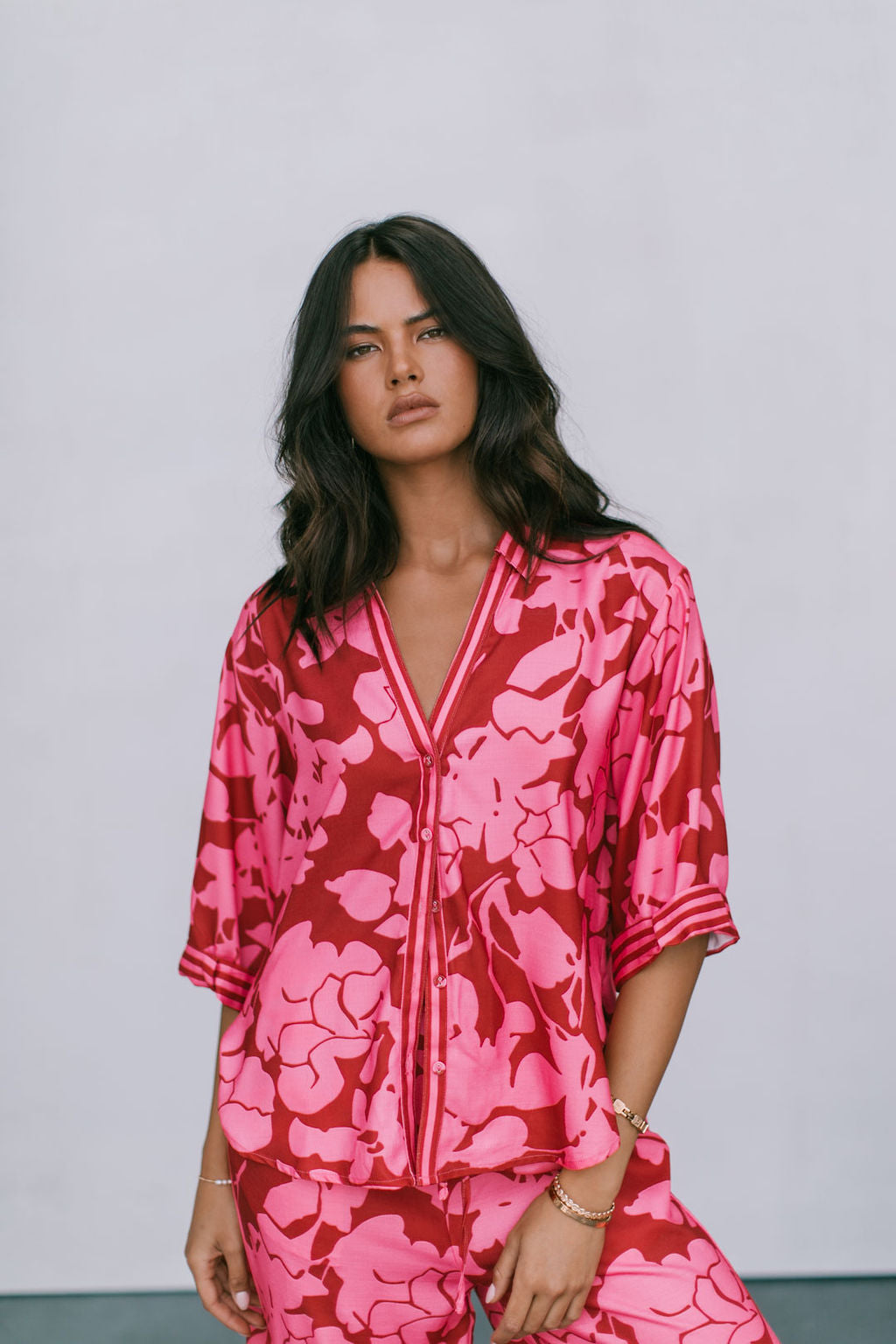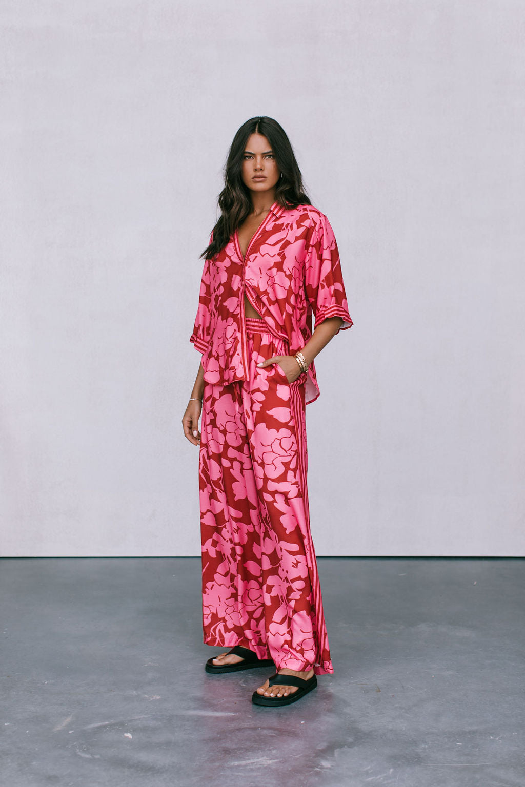Standout printed two-piece matching pant + shirt set. Exclusive bold plum + soft pink floral printed fabrication.