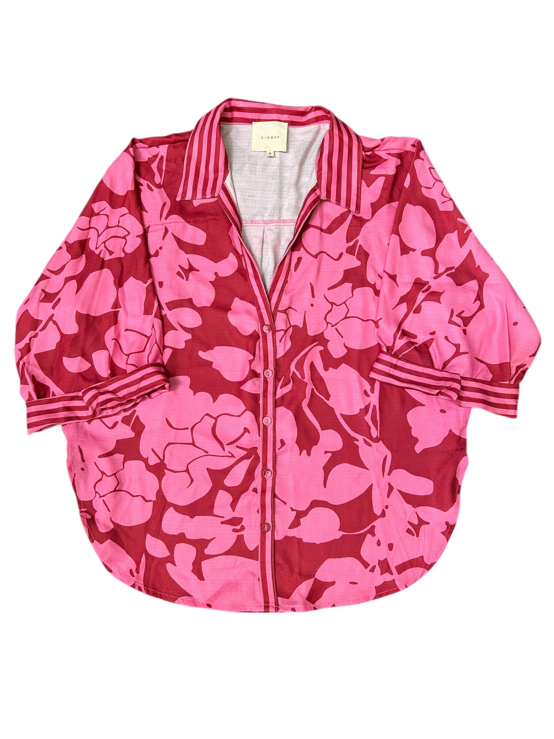 Make a statement in our printed Tripoli Set by Cinque, exclusive to MMB. A chic matching pant set boasting bold plum + pink florals, with a contrasting stripe. Her boxy shirt is paired with ultra-wide resort pants, exuding effortless style.