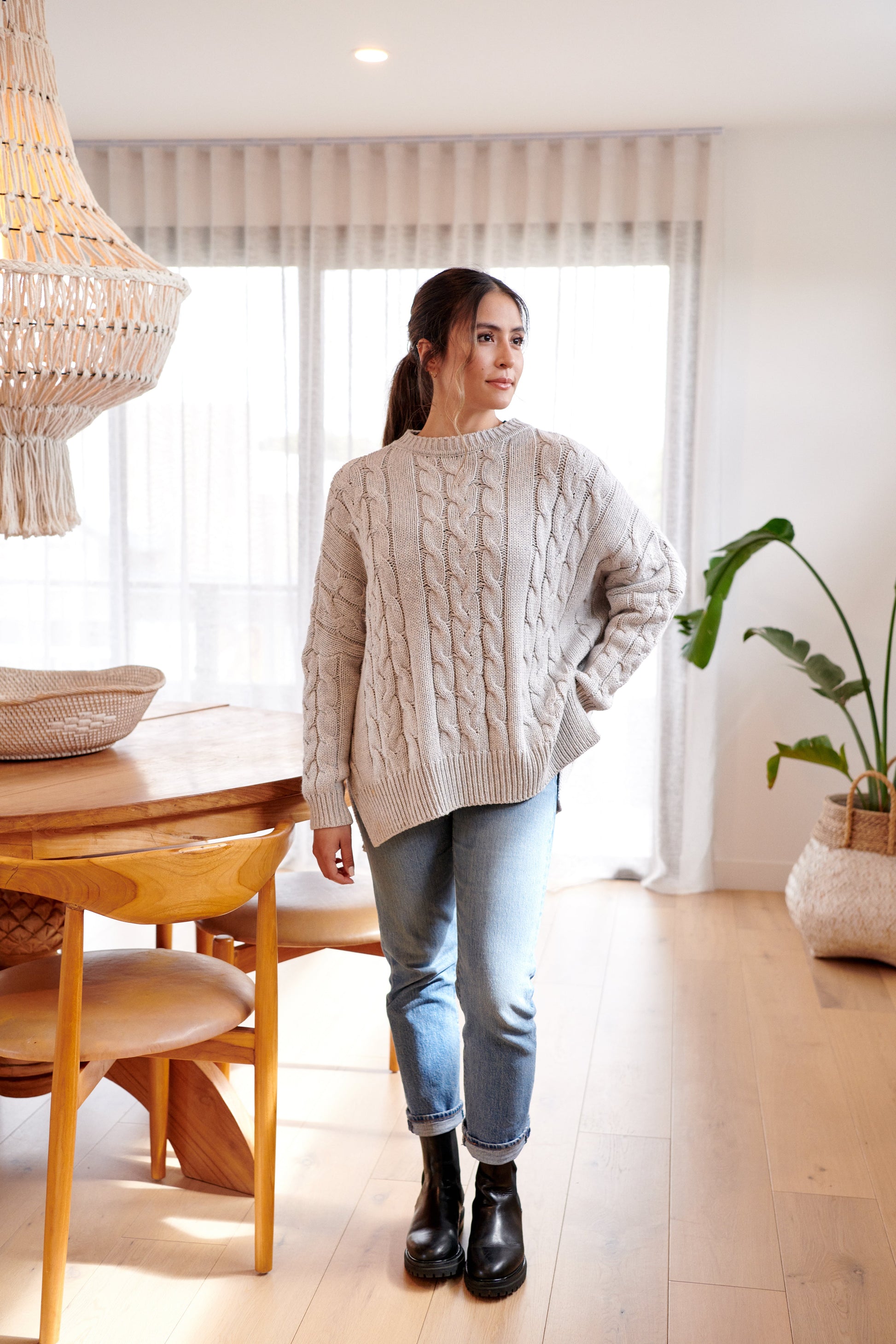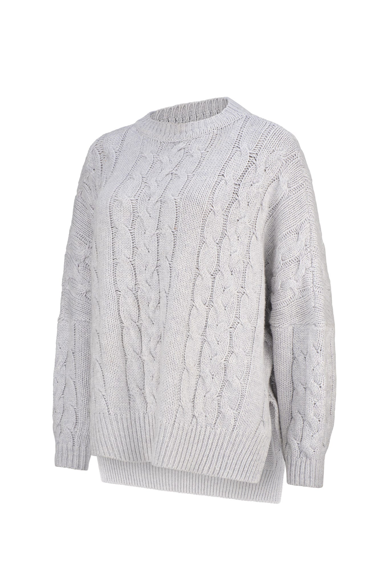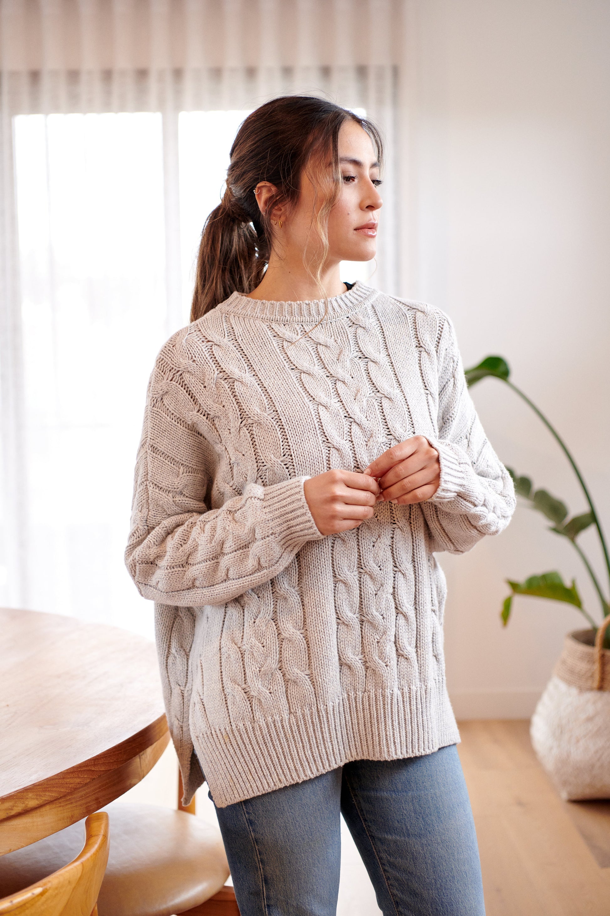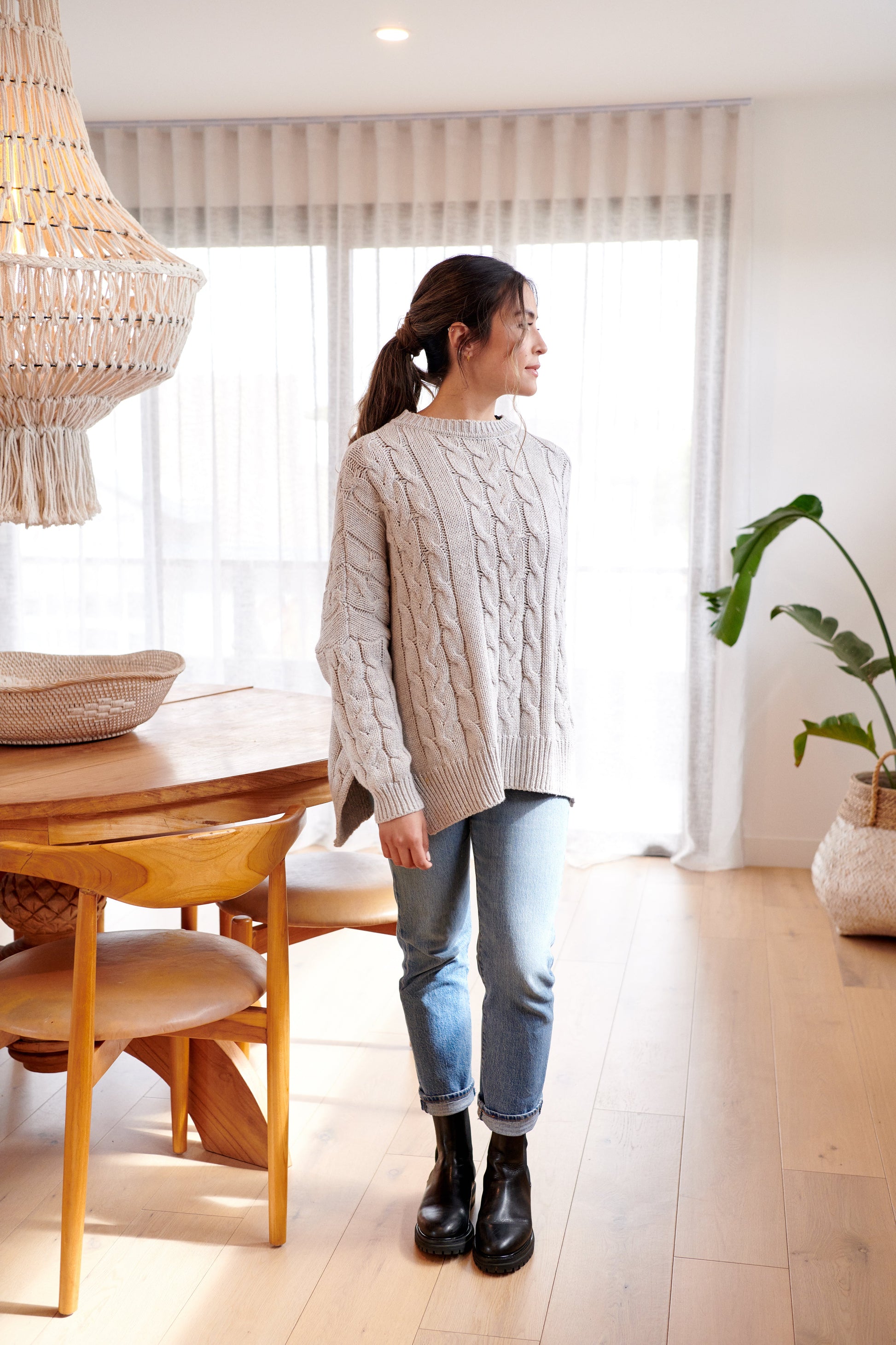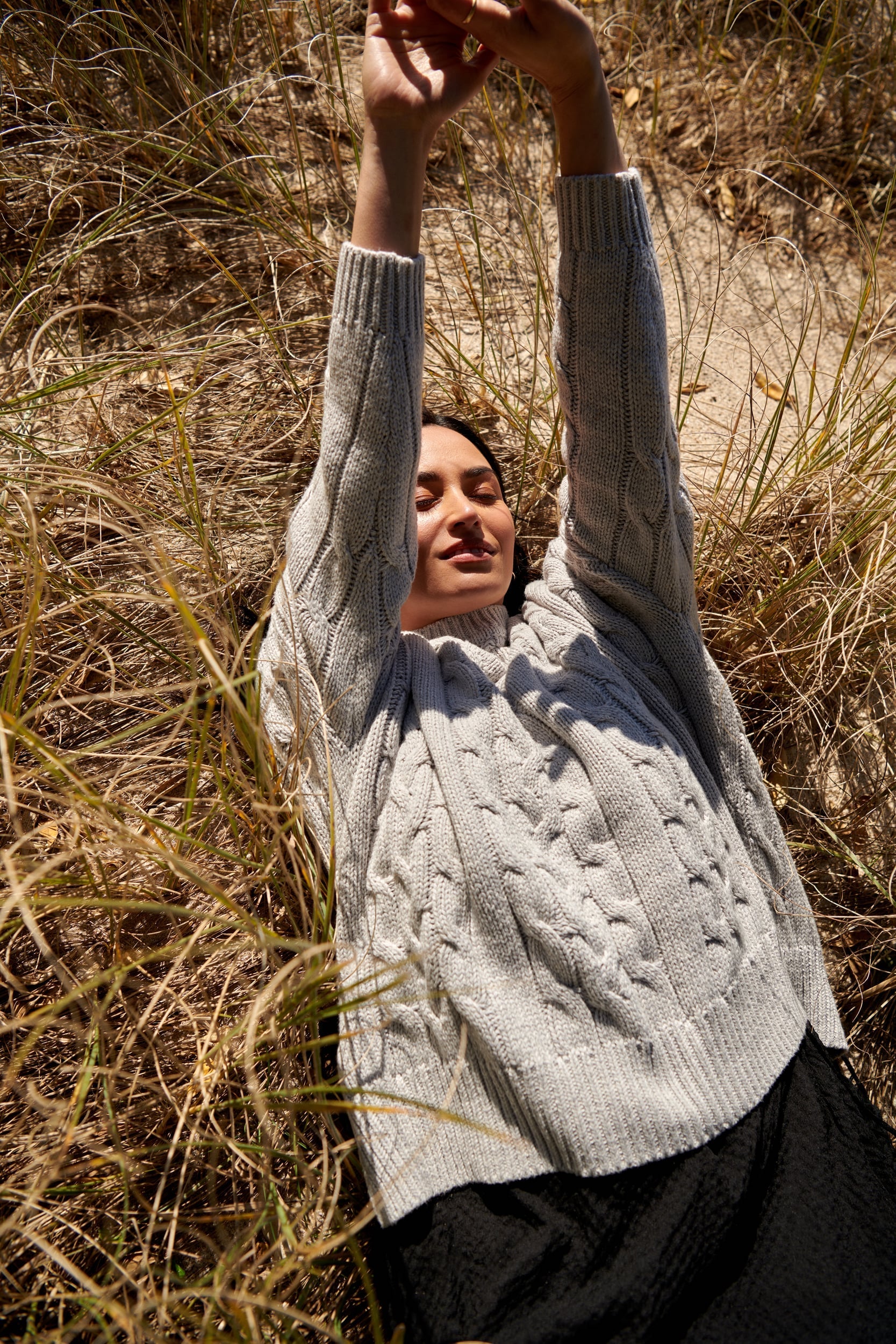 This cable pullover highlights our signature style and is our most beloved best-seller. It’s a classic knitwear piece reimagined with a contemporary oversized, cape-like fit. The crew neck pullover includes a drop shoulder design and a split-dropped hem. The ribbed crew neck, cuffs, and hem complement our in-house designed cable pattern.